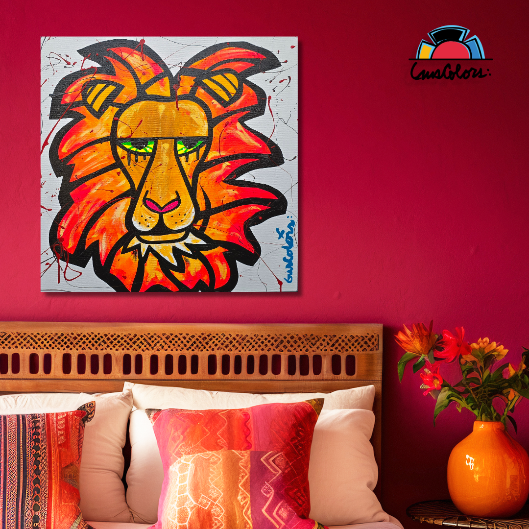 This powerful GusColors lion bursts with energy, its mane transformed into blazing flames that symbolize strength, courage, and raw prowess. A striking fusion of color and fire, this piece captures the untamed spirit of the king of the jungle in a dramatic pop‑art style.